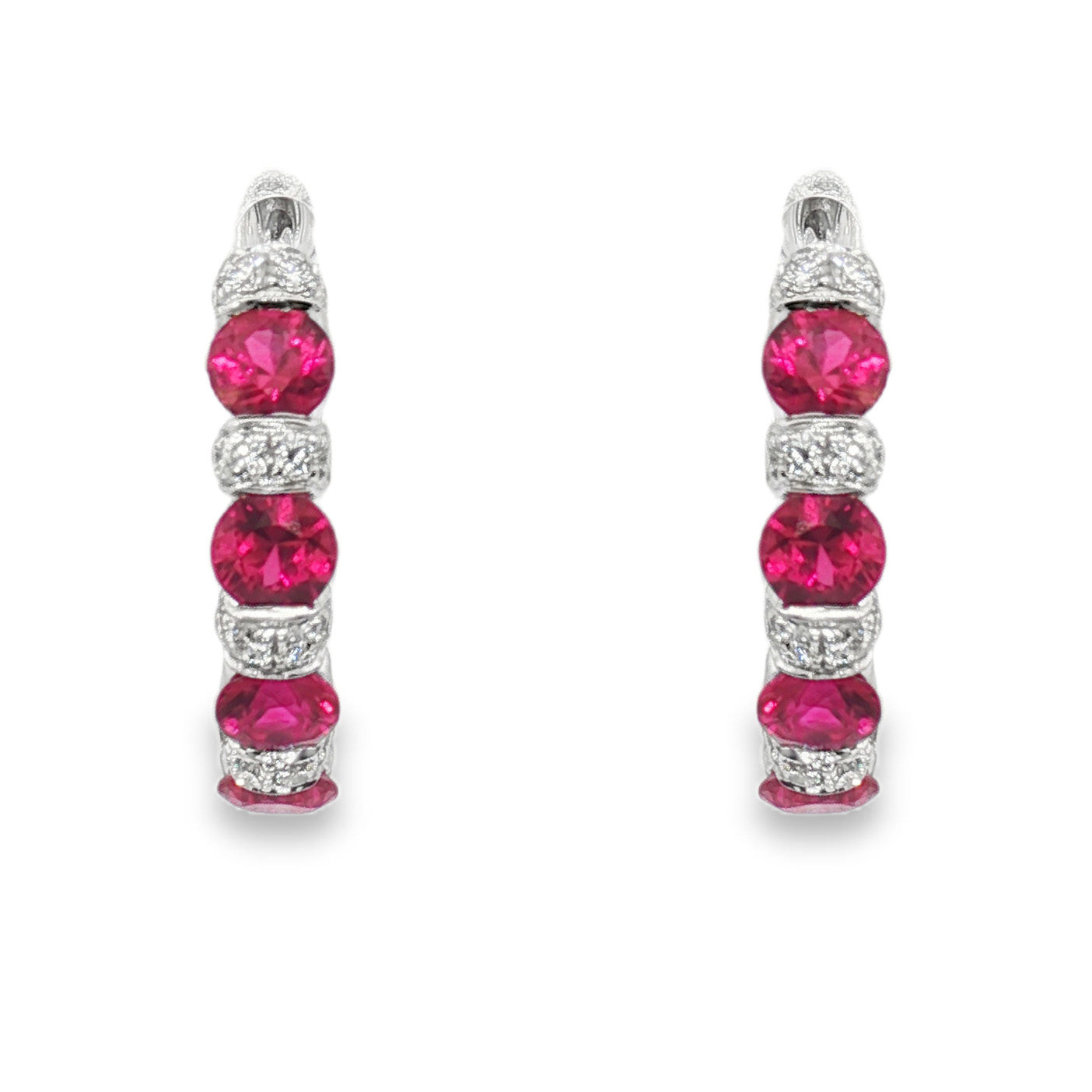 Pair of 18K White Gold Ruby and Diamond Hoop Earrings set with 30 Diamonds (GH/VS) (0.26ctw) and 8 Round Rubies (1.04ctw)