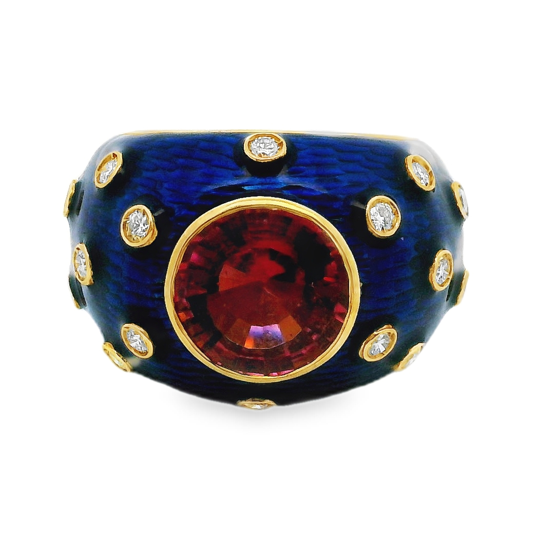 18K Yellow Gold & Blue Enamel Ring Set with 1 Round Pink Tourmaline (10×6.3, approx. 3.25ct) and 16 Round Diamonds (approx. 0.56ctw), Size 6.75