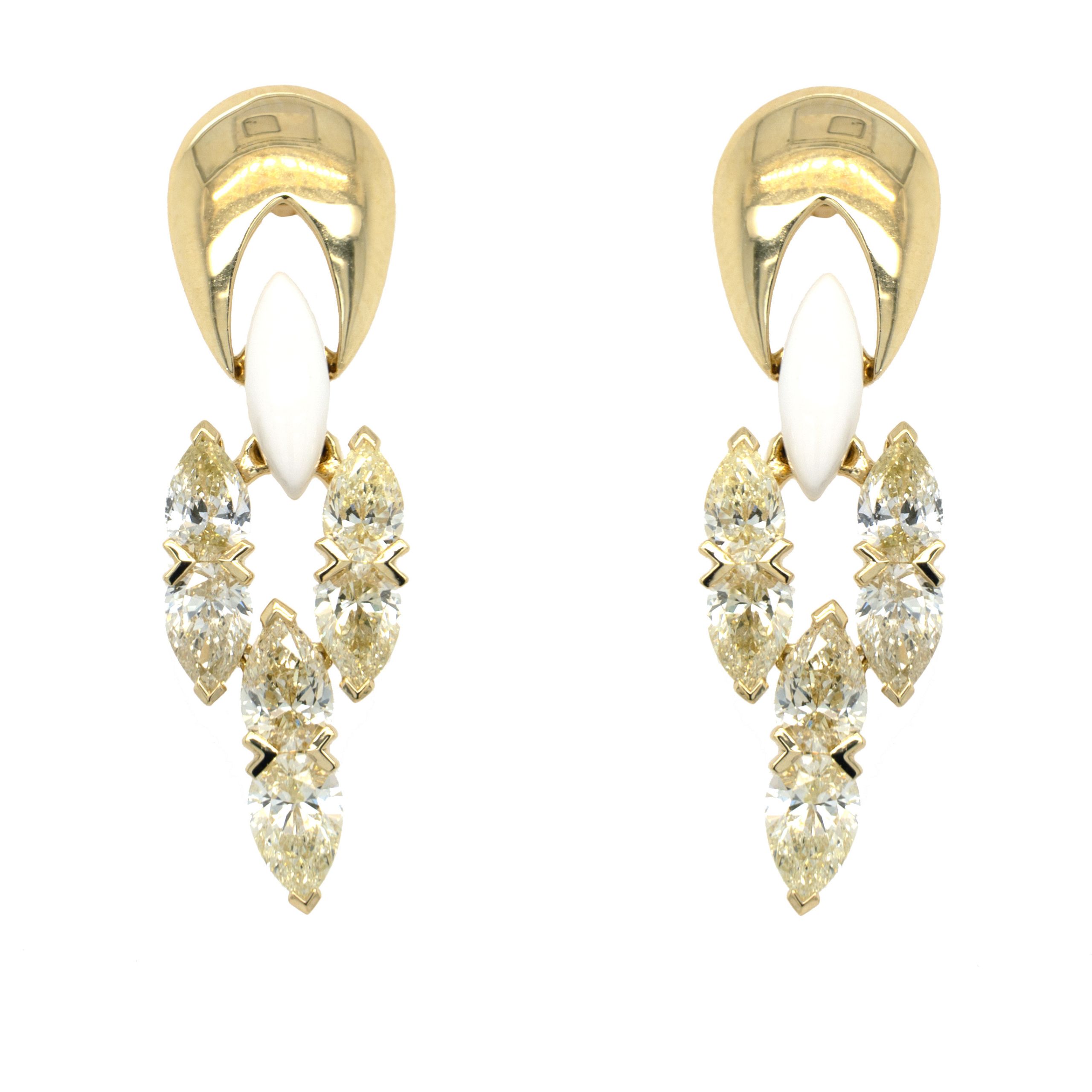 18K Yellow Gold Yellow Diamond Earrings With 12 Pear-Shaped Yellow Diamonds (3.05Ctw) And White Ceramic Accents
