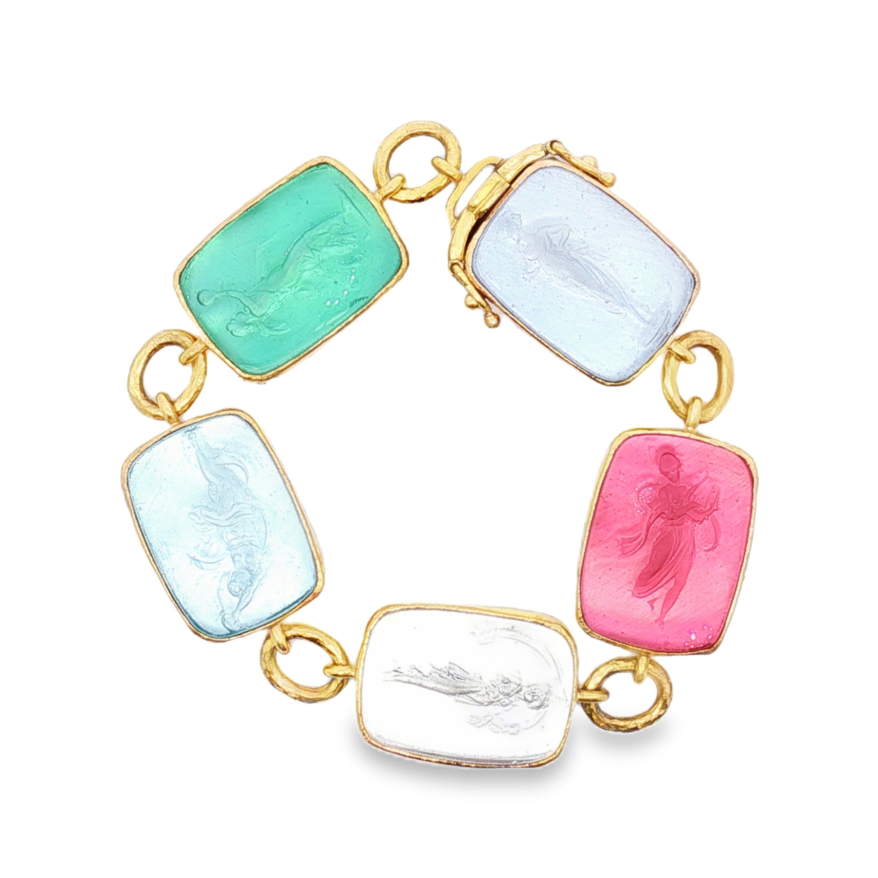 19K yellow gold venetian glass bracelet set with 5 venetian glass intaglios backed by mother of pearl