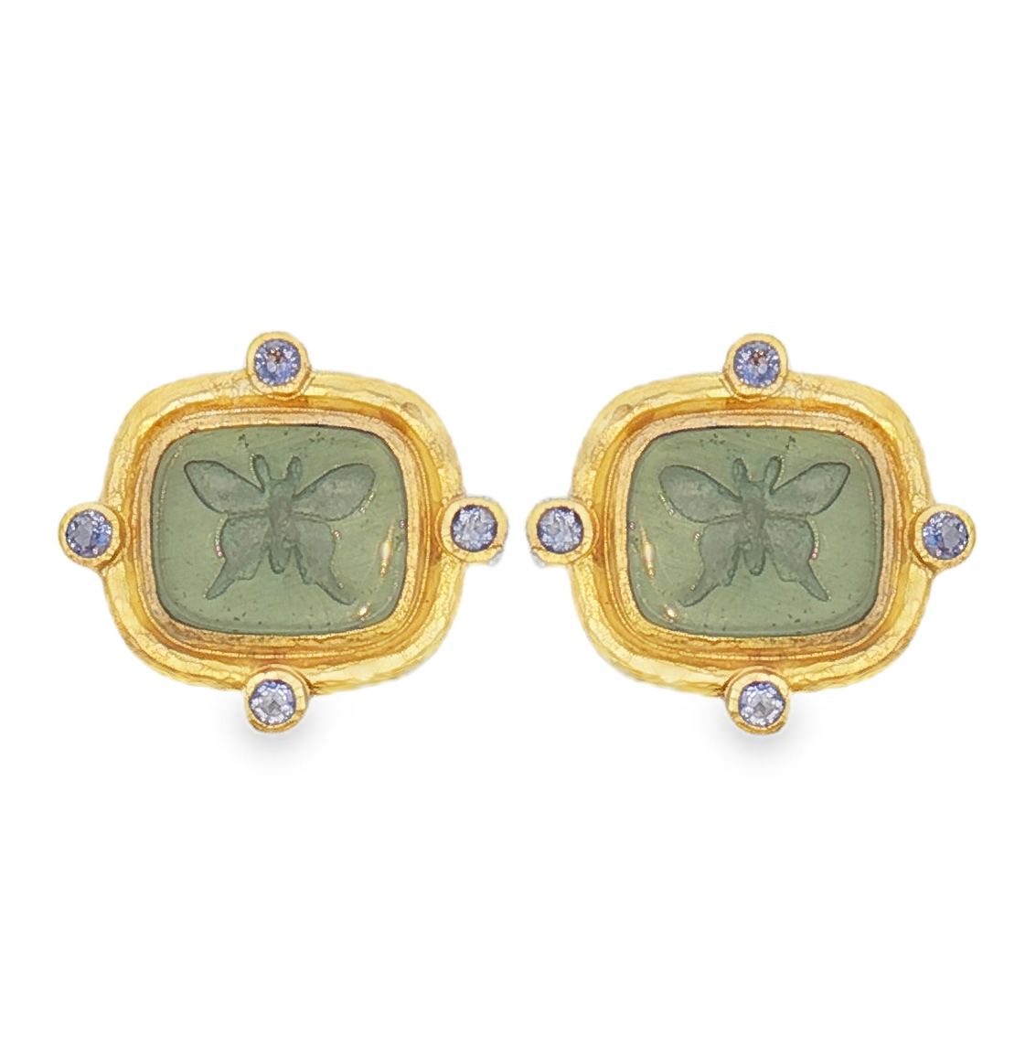19K Yellow Gold Venetian Glass/Iolite Earrings Set with Two Venetian Glass “Butterfly” Intaglios and 8 Round Iolites (2.5mm each)