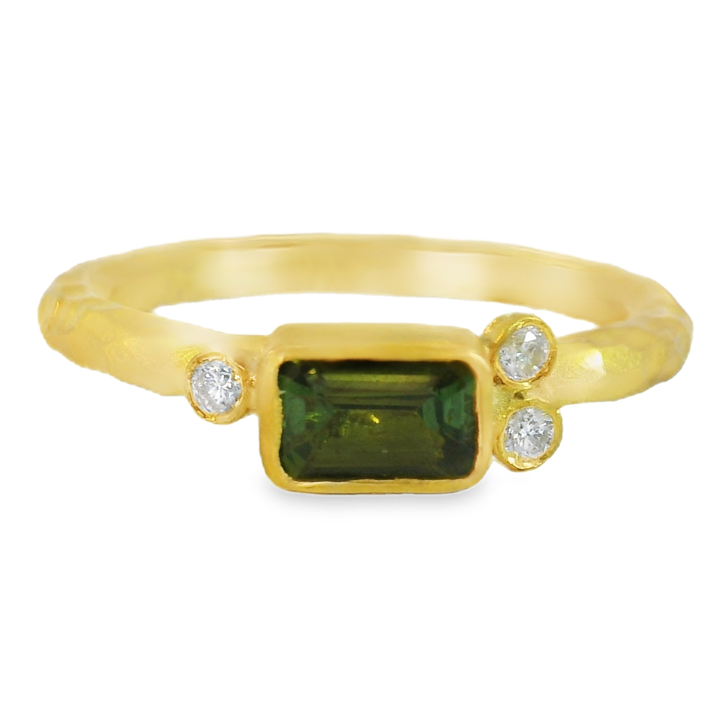 24K Yellow Gold Green Tourmaline and Diamond Ring with One Emerald Cut Green Tourmaline (0.20ct) and Three Round Diamonds (0.03ct)