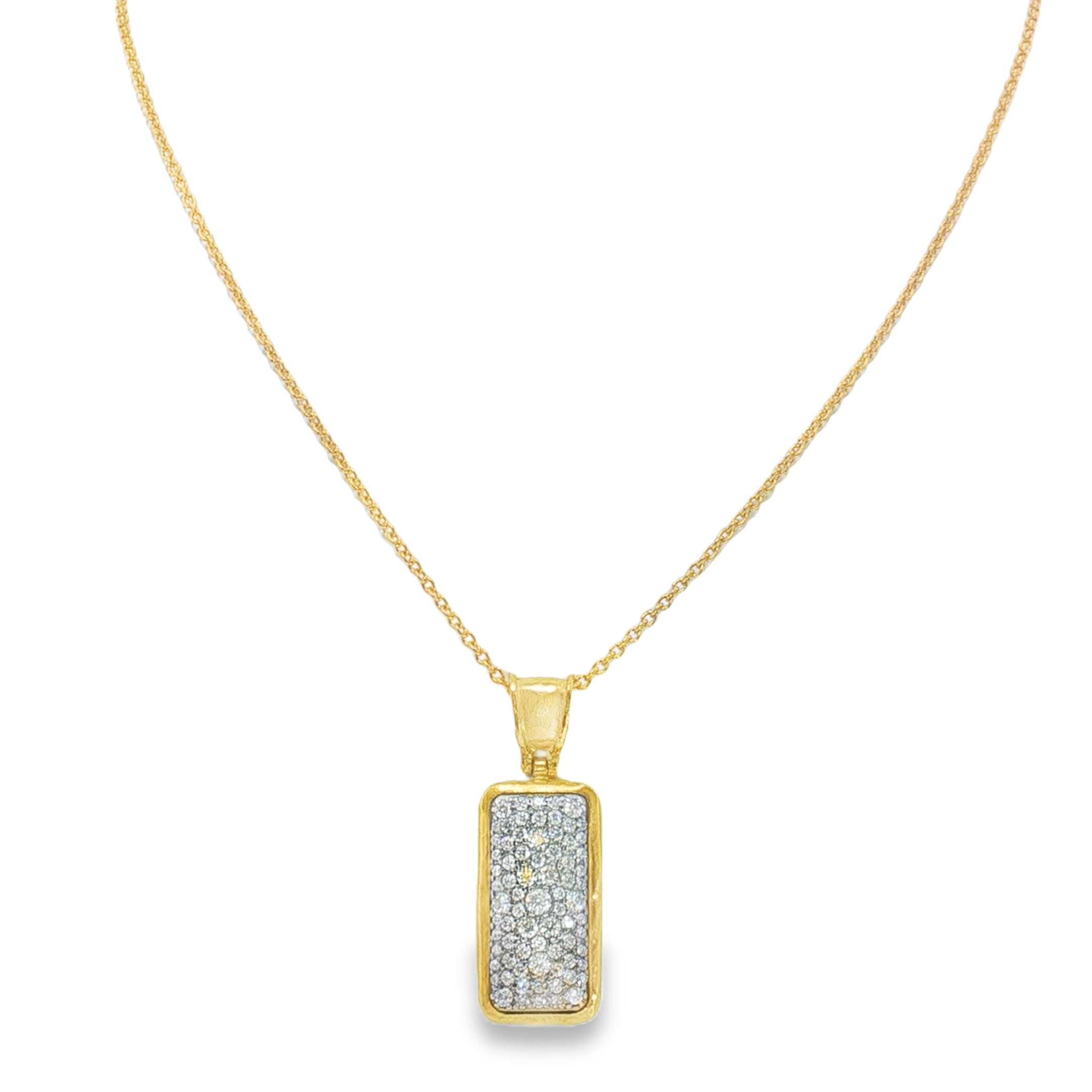 24K Yellow Gold Mixed Diamond Necklace with 55 Mixed Shape Diamonds (1.11CTW) Pave Set in Blackened White Gold 18″ Length Chain with 18K Lobster Clasp
