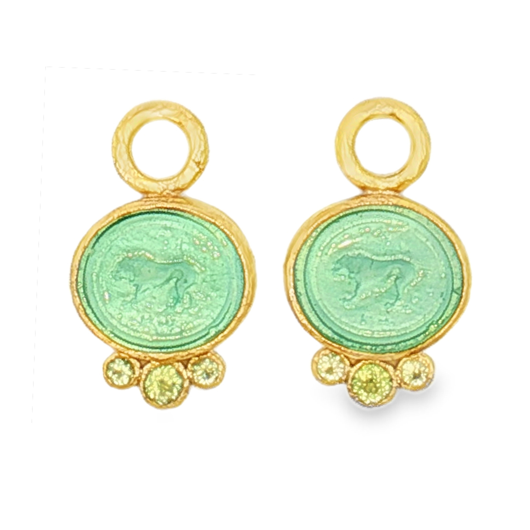 Pair of 19K Yellow Gold Venetian Glass Intaglio “Stalking Lion” Ear Charms with 6 Round Peridot (0.42ctw)
