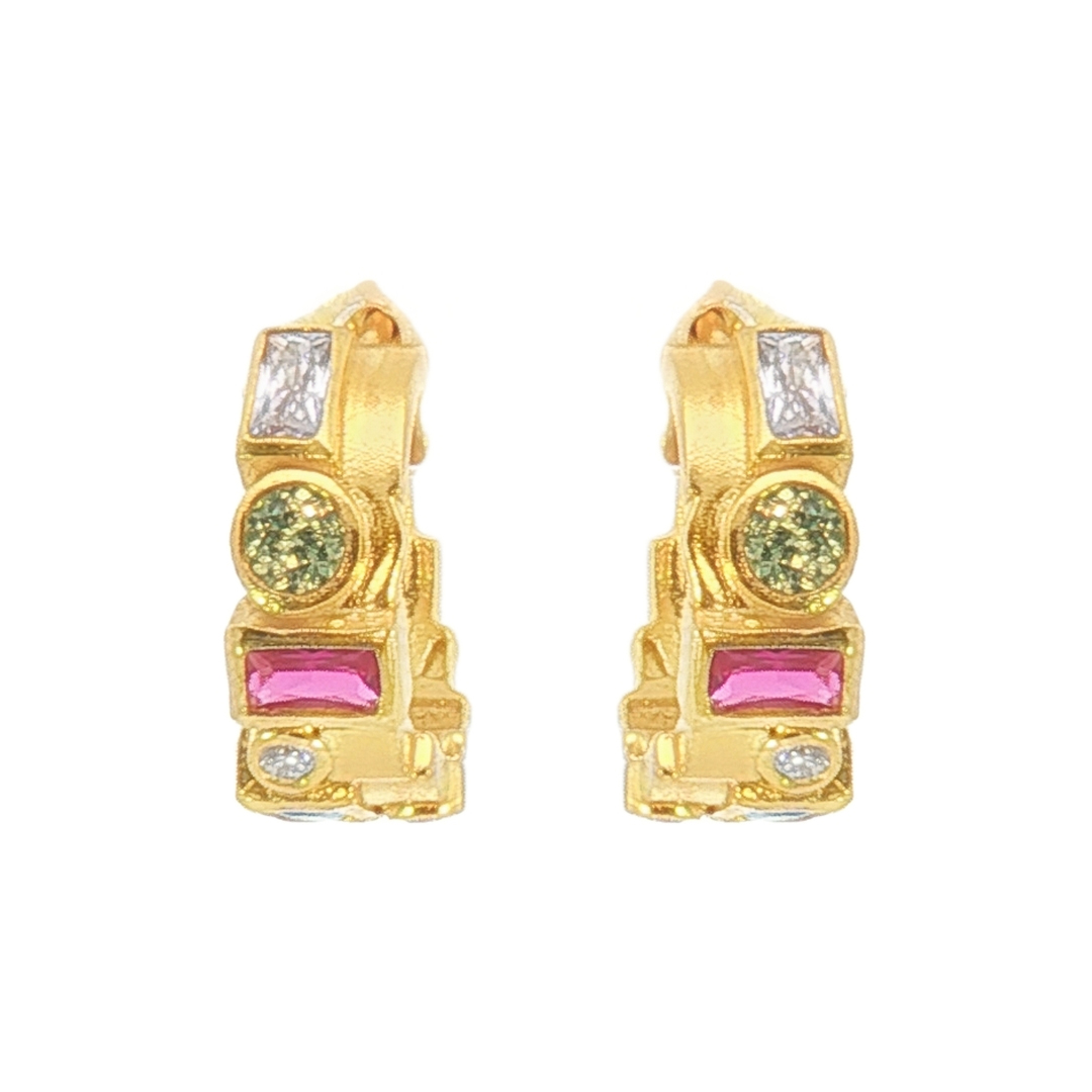 Pair of 22K Yellow Gold Klimth Hoop Earrings Mixed Siae and Shape Faceted Multi Stones (Demantoid, Garnet, Rhodalite, Topaz (1.64ctw) and Diamonds( 0.084ctw) 18K Yellow Gold Post wity Vermeil Push Backs Push Backs