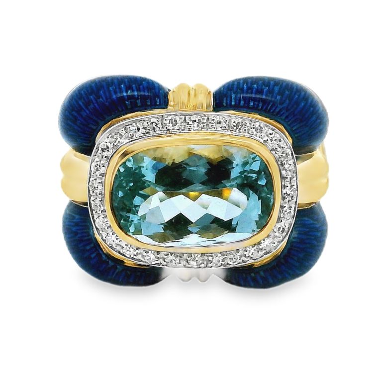 18K Yellow and White Gold Aquamarine Diamond Enamel Ring